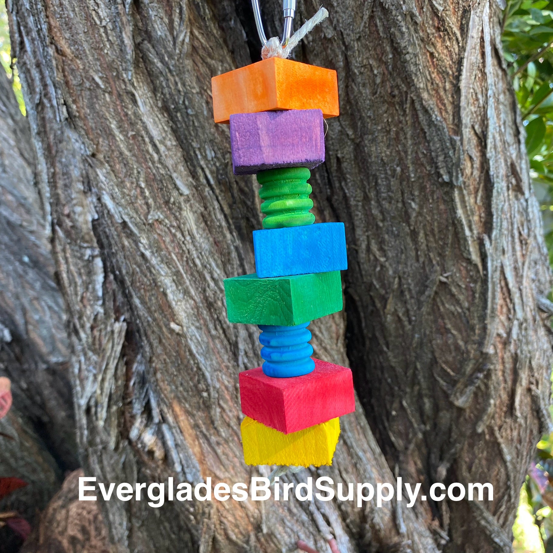 Give your bird the ultimate chew toy and throw a little color into it! Handmade in sunny South Florida this 8 inch toy is made from all-natural food safe colored pine wood blocks and beads. The toy is held together by natural hemp rope! Chewing on the natural pine wood can help naturally dull down sharp beaks.