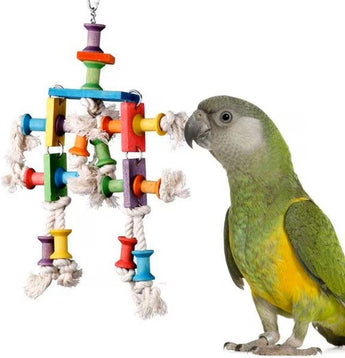 The colorful wooden spools on this toy will bob and dance when your birds plays with it. Adorned with short strands of fun to preen 100% cotton rope.