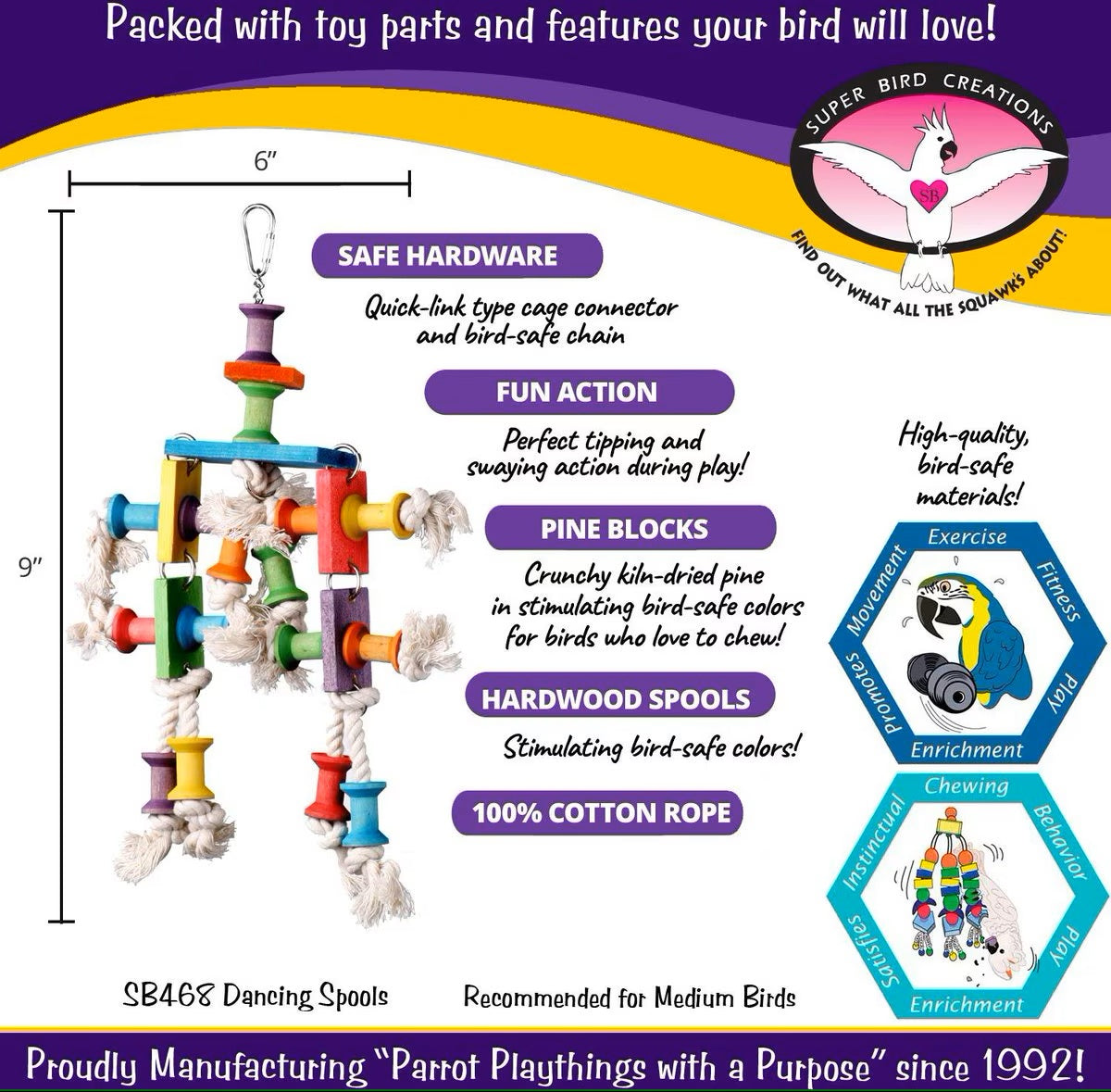 - Super Bird Creations toy designs use a diverse selection of stimulating bird-safe materials to ensure the mental and physical well being of pet birds