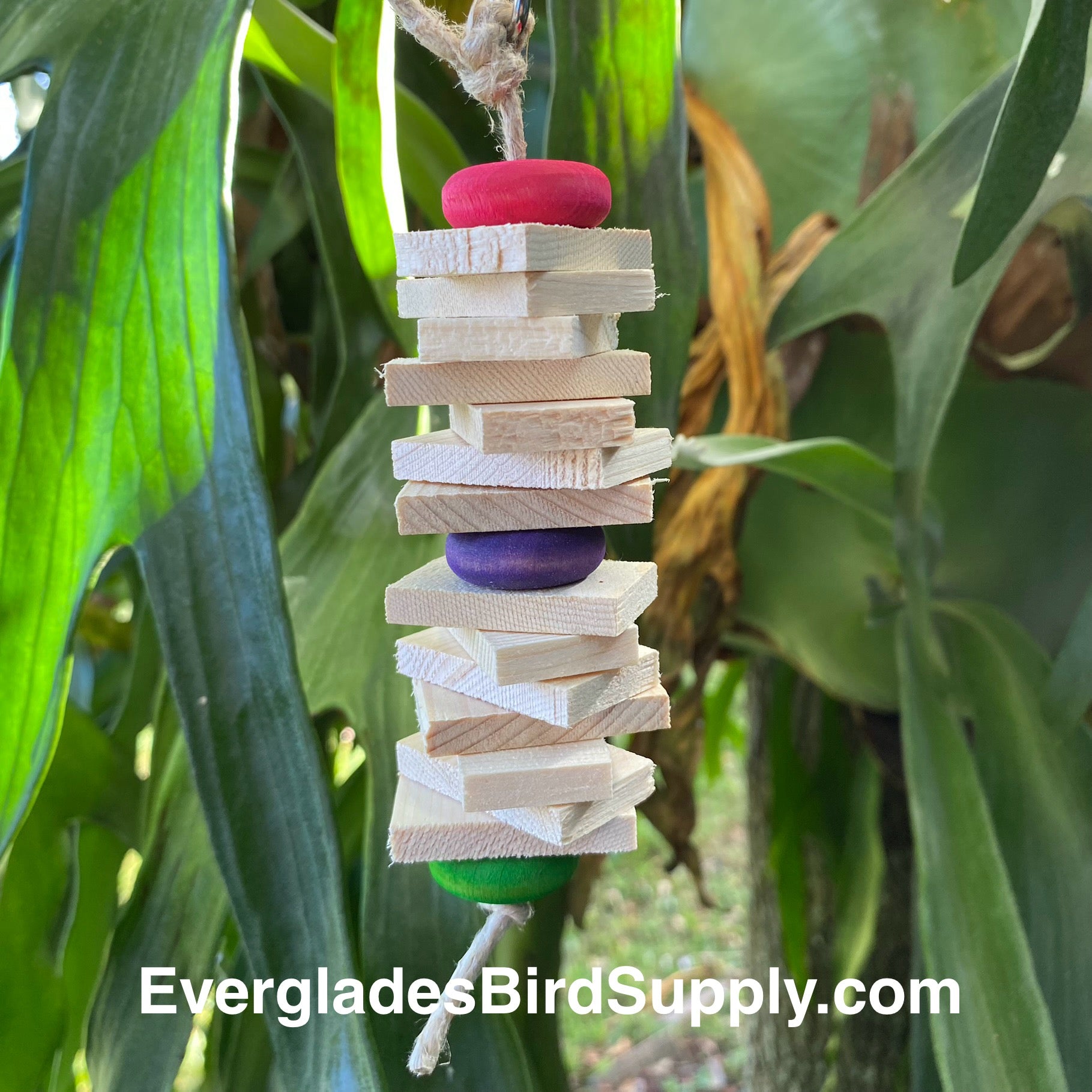 Give your bird the ultimate chew toy! This 6 inch toy is made from all-natural pine wood slices, food safe colored pine wood beads and held together by natural hemp rope! Chewing on the natural pine slices can help naturally dull down sharp beaks.