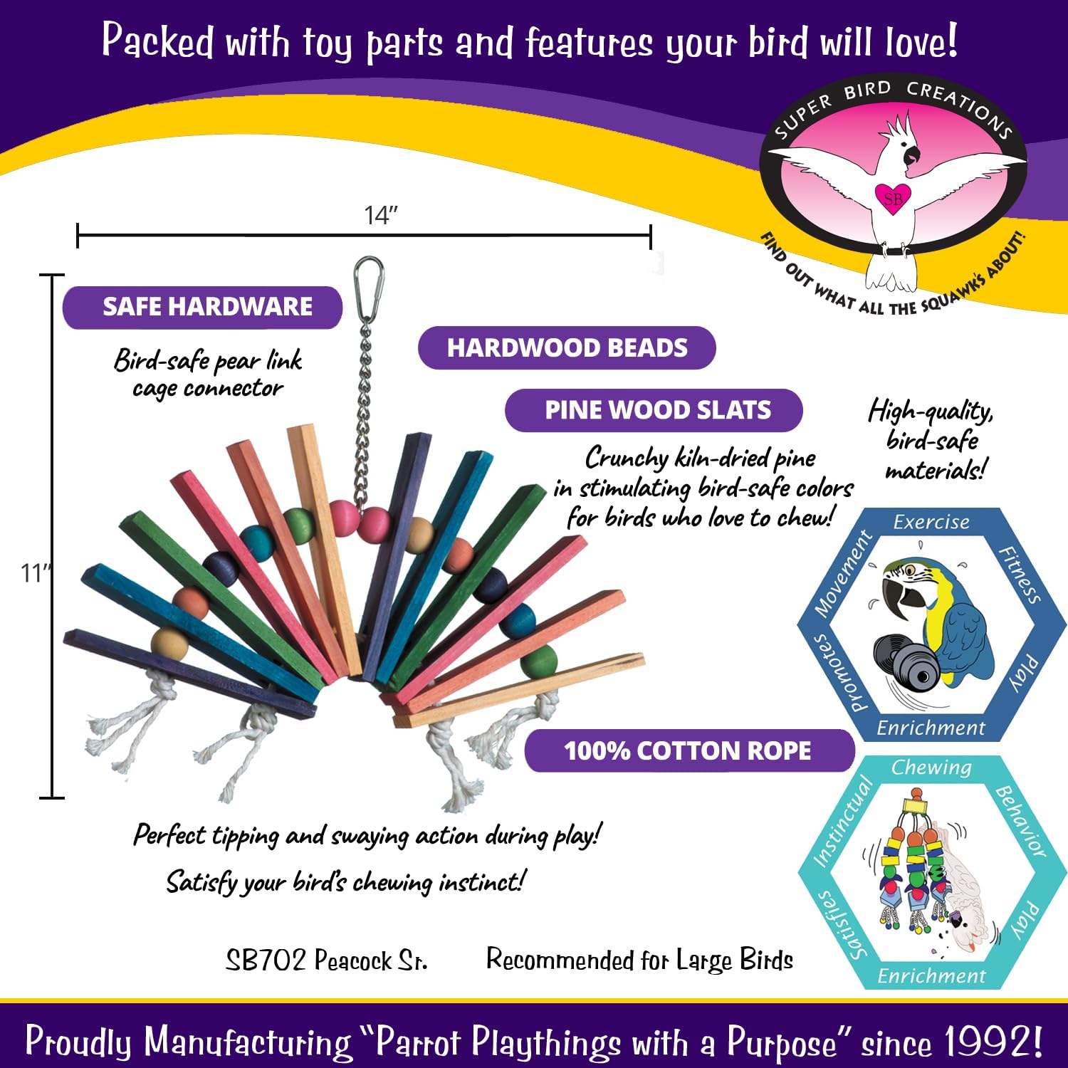 - Super Bird Creations toy designs use a diverse selection of stimulating bird-safe materials to ensure the mental and physical well being of pet birds