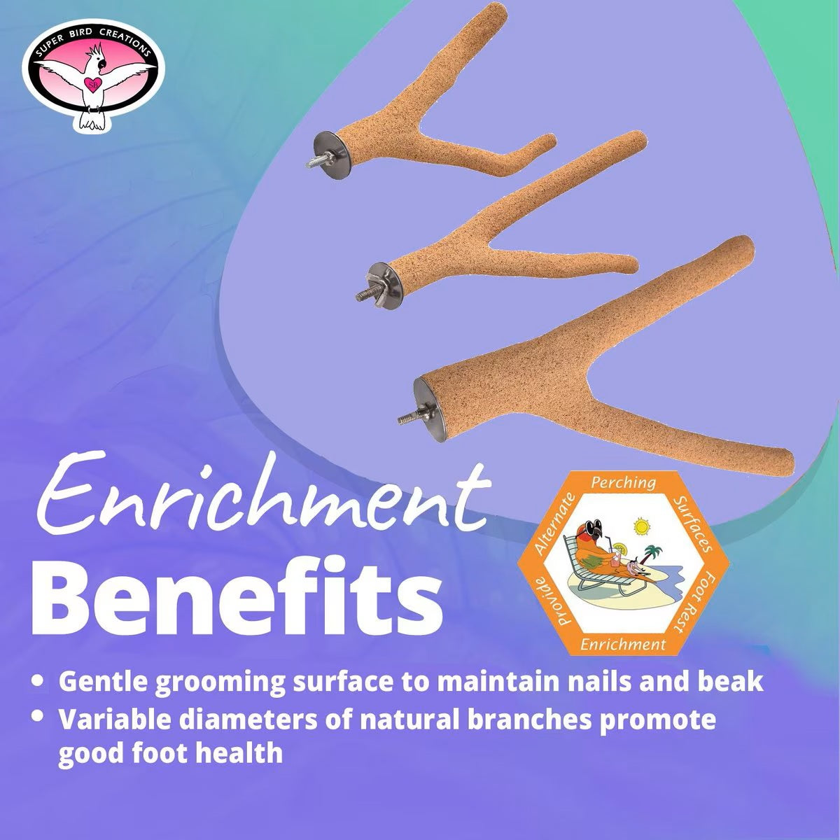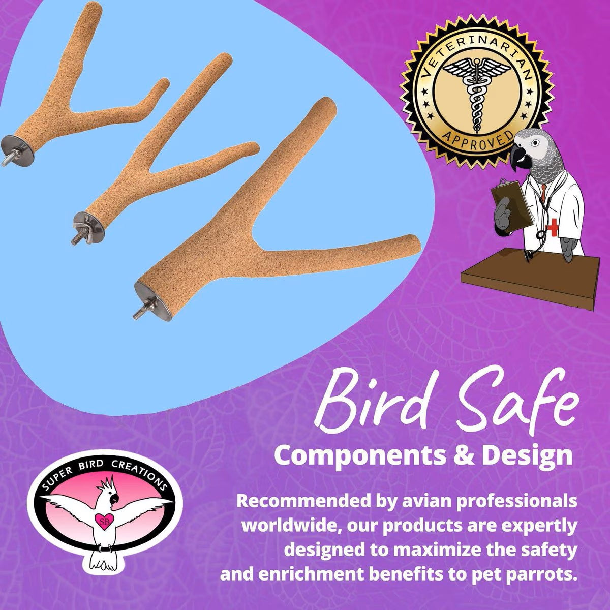• Super Bird Creations toy designs use a diverse selection of stimulating bird-safe materials to ensure the mental and physical well being of pet birds